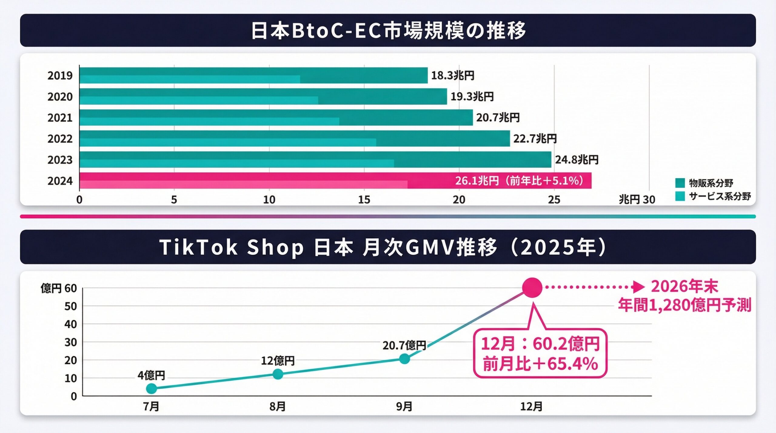 そしてこの成長を最も加速させているのが、TikTok Shopです。2024年6月に日本でサービスが開始されたTikTok Shopは、わずか半年で累計GMV 155億円を突破。2025年12月の単月GMVは約60.2億円(前月比+65.4%)に達し、2026年末には年間1,280億円規模への到達が予測されています。