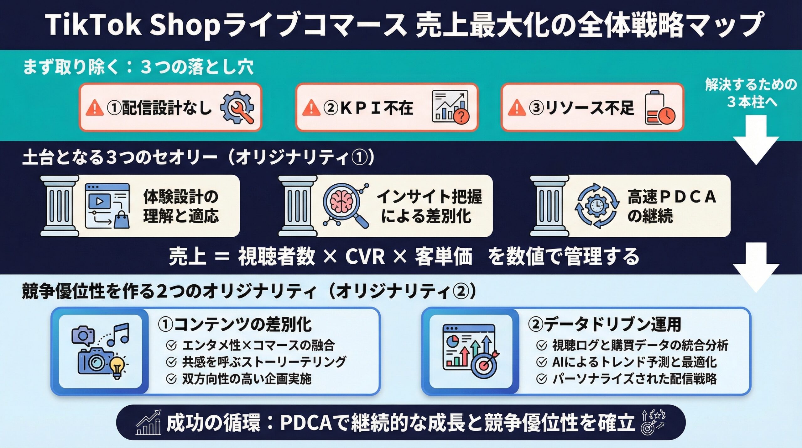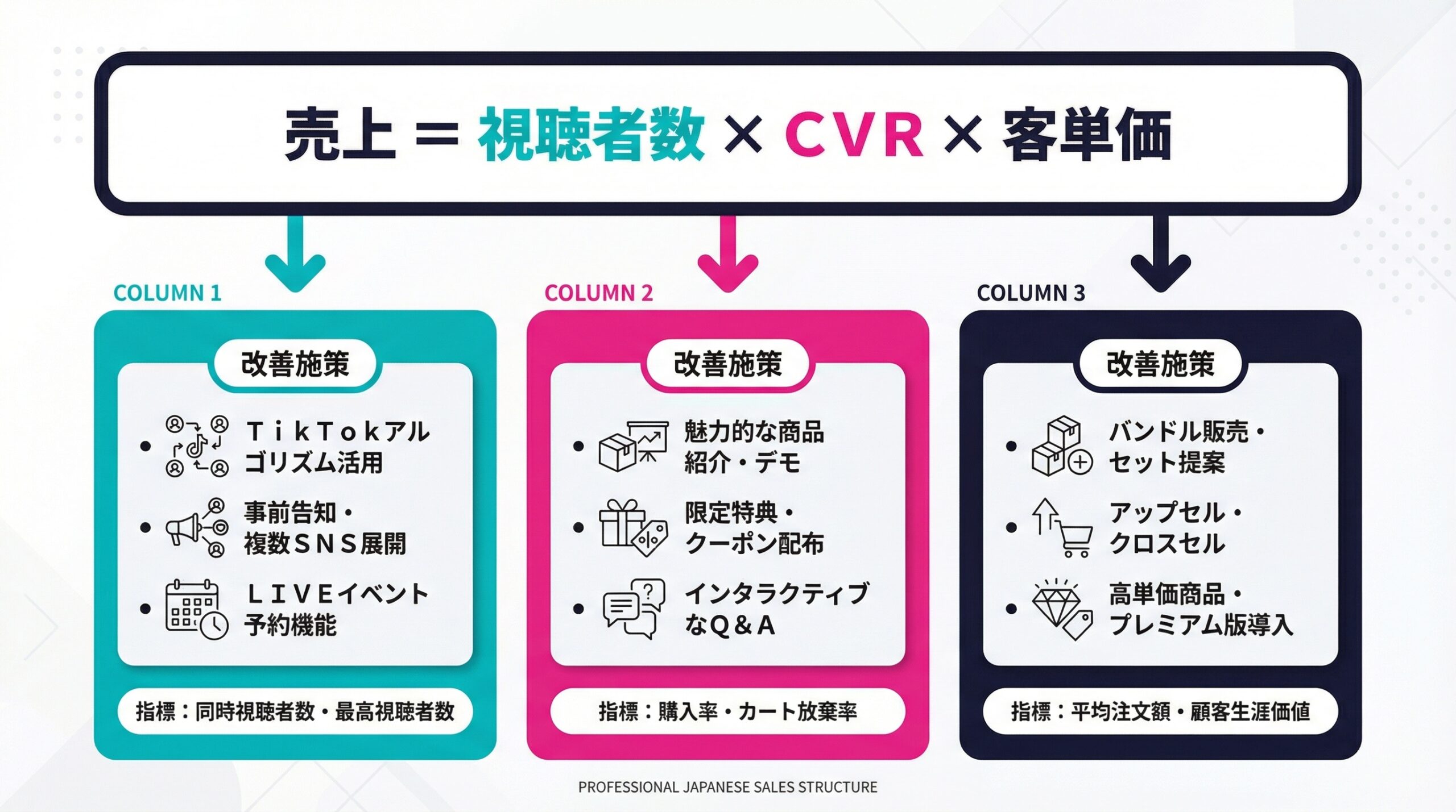 - 売上構造(視聴者数×CVR×客単価)を把握し、ボトルネックを特定して改善する
