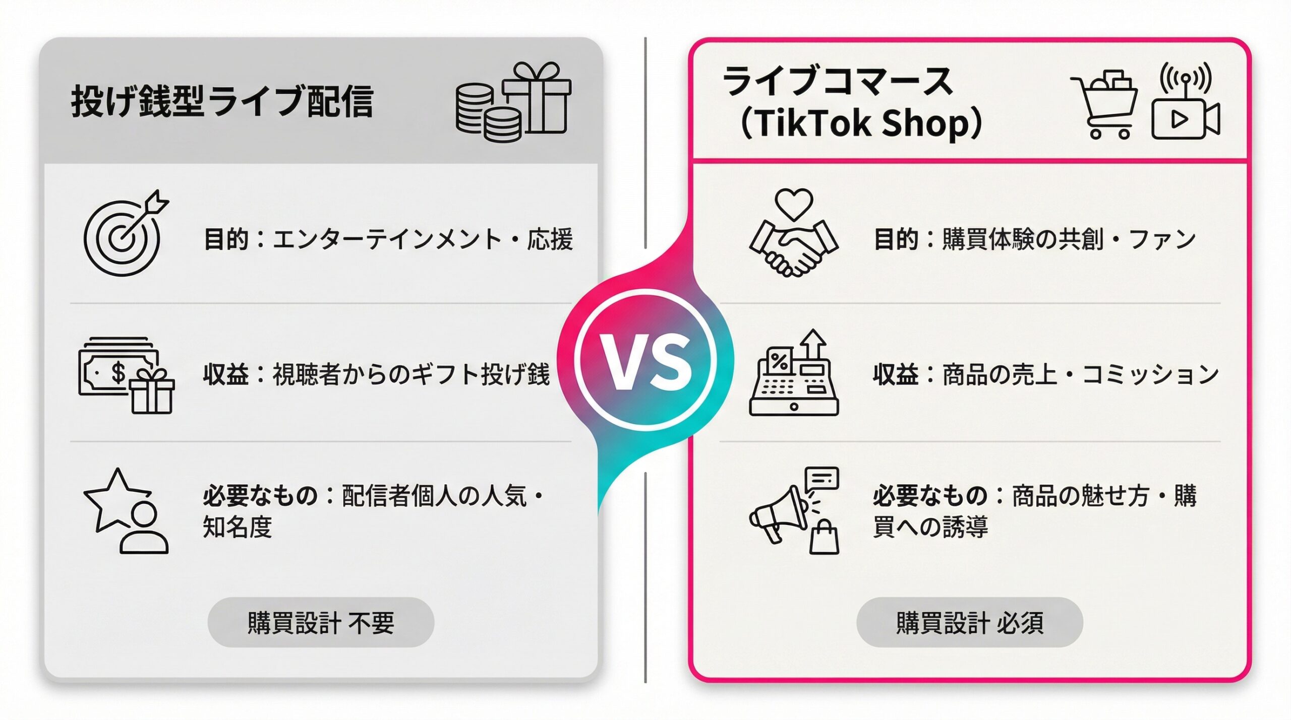 なお、すべての商材がTikTok Shopのショート動画販売に適しているわけではありません。商材の特性・価格帯・ターゲット層によっては、ライブコマースに特化した戦略の方が高い成果を生む場合があります。まずは自社商材の特性を正確に見極めることが、成功への第一歩です。