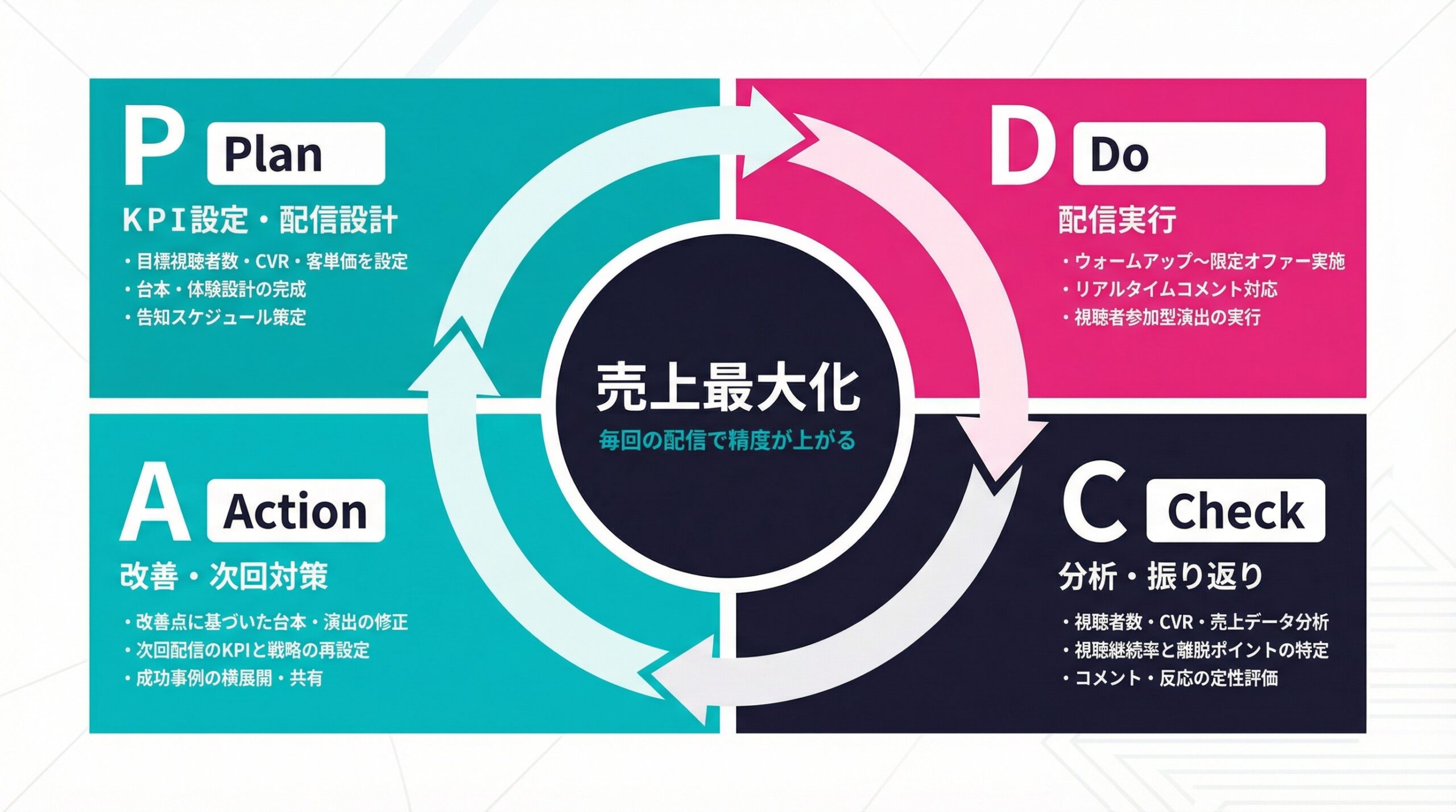 1回の配信で完成するライブコマースはありません。配信ごとにKPIを確認し、視聴者数が伸び悩むなら告知強化、CVRが低いなら限定オファーや台本改善、客単価が低ければセット販売の導入を検討する。このPDCAサイクルを最速で回し続けることが、競合を引き離す最も確実な方法です。