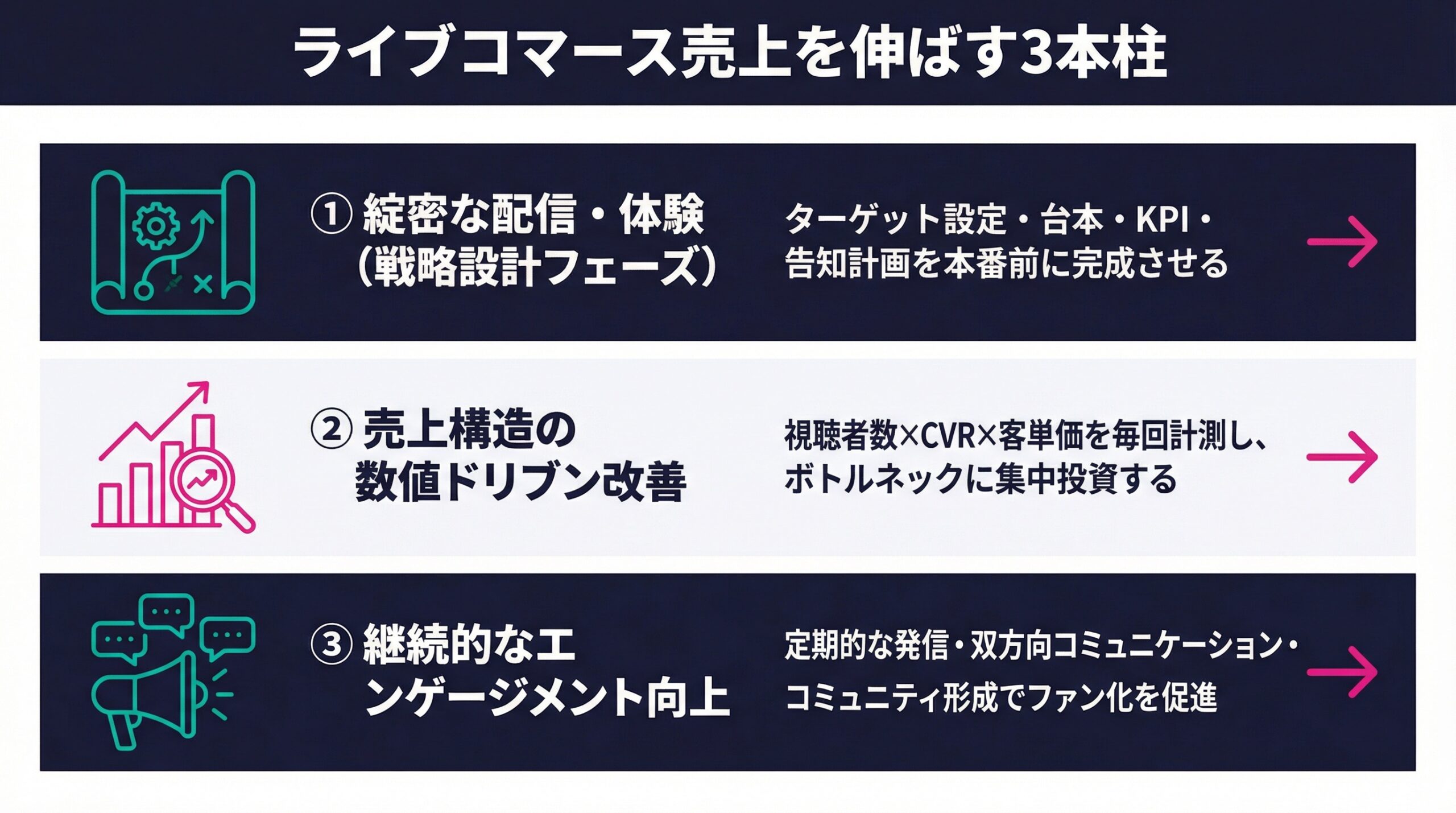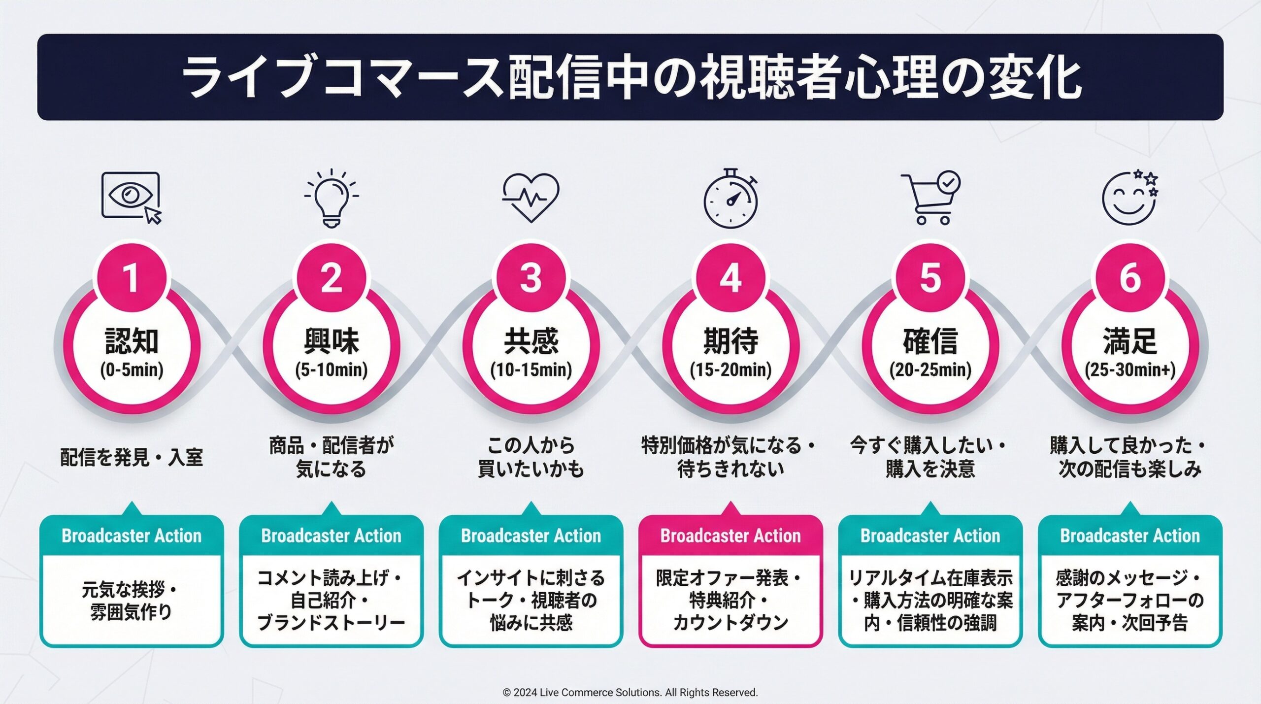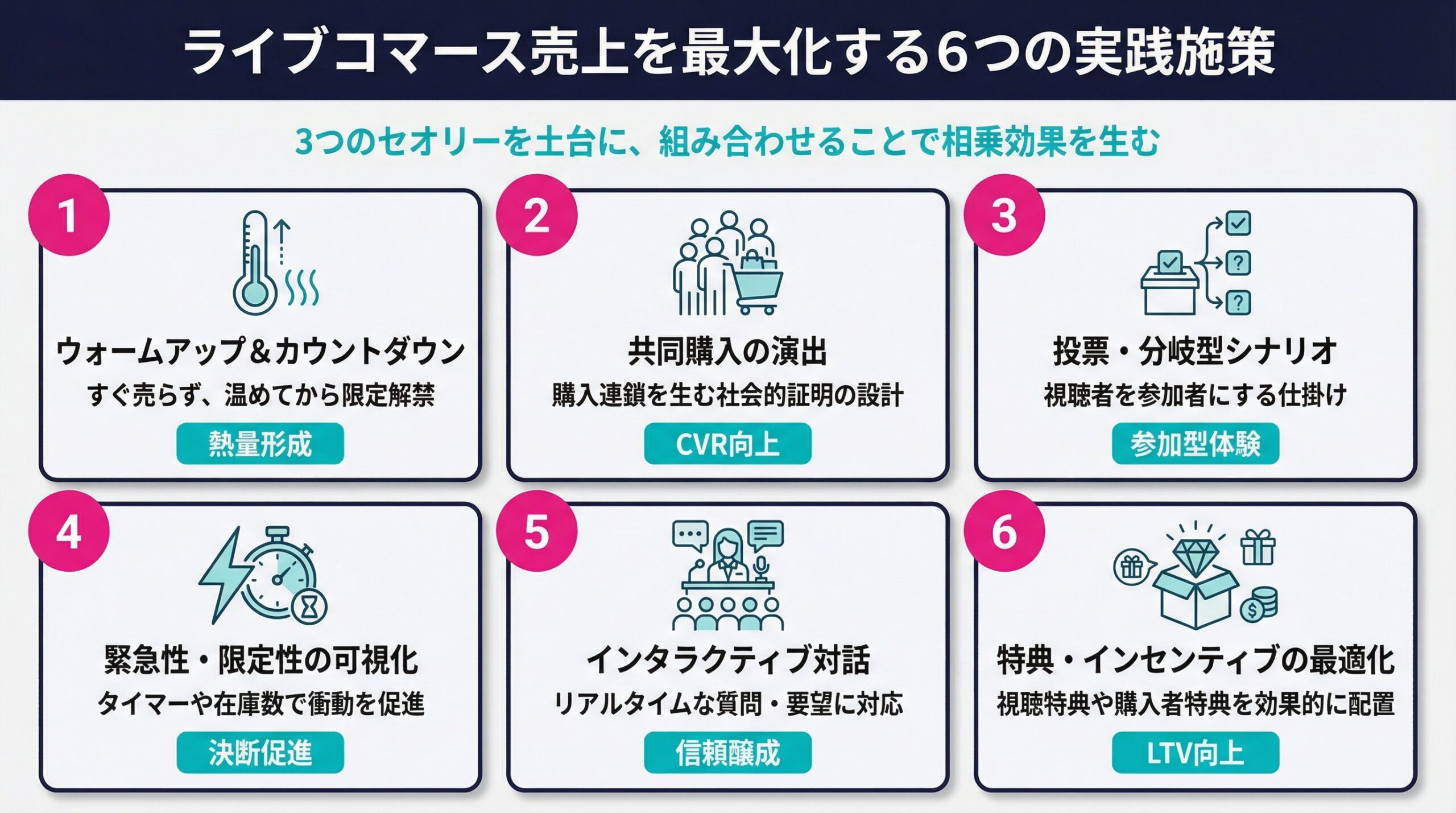 2つのセオリーを土台に、実際の配信で売上を最大化するための6つの施策を解説します。これらはそれぞれ単独で機能するだけでなく、組み合わせることで相乗効果を生みます。